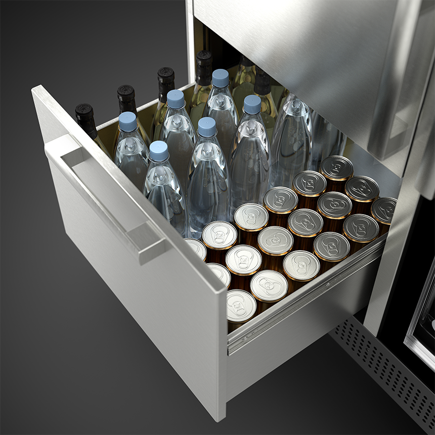 - Dry-storage drawer has ample clearance for standing bottles